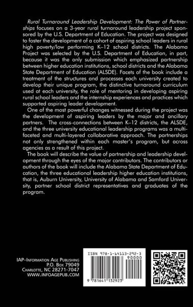 Rural Turnaround Leadership Development: The Power of Partnerships focuses on a three-year rural turnaround leadership project sponsored by the U.S. Department of Education. The project was designed to foster the development of a cohort of aspiring school leaders in rural high poverty/low performing K-12 school districts. The Alabama Project was selected by the U.S. Department of Education, in part, because it was the only submission which emphasized partnership between higher education institutions, school districts and the Alabama State Department of Education (ALSDE). Facets of the book include a treatment of the structures and processes each university created to develop their unique program, the distinctive turnaround curriculum used at each university, the role of mentoring in developing aspiring rural school leaders and the internship experiences and practices which supported aspiring leader development. One of the most powerful changes witnessed during the project was the development of aspiring leaders by the major and ancillary partners. The cross-connections between K-12 districts, the ALSDE, and the three university educational leadership programs was a multifaceted and multi-layered collaborative approach. The partnerships not only strengthened within each master's program, but across agencies as a result of this project. The book will describe the value of partnership and leadership development through the eyes of the major contributors. The contributors or authors of the book will include the Alabama State Department of Education, the three educational leadership higher education institutions i.e. Auburn University, University of Alabama and Samford University, partner school district representatives and graduates of the program.