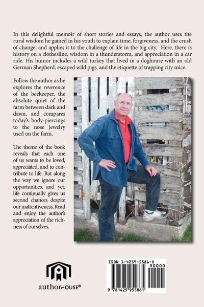In this delightful memoir of short stories and essays, the author uses the rural wisdom he gained in his youth to explain time, forgiveness, and the crush of change; and applies it the challenge of life in the big city. Here, there is history on a clothesline, wisdom in a thunderstorm, and appreciation in a car ride. His humor includes a wild turkey that lived in a doghouse with an old German Shepherd, escaped wild pigs, and the etiquette of trapping city mice. Follow the author as he explores the reverence of the beekeeper, the absolute quiet of the farm between dark and dawn, and compares today's body-piercings to the nose jewelry used on the farm. The theme of the book reveals that each one of us wants to be loved, appreciated, and to contribute to life. But along the way we ignore our opportunities, and yet, life continually gives us second chances despite our inattentiveness. Read and enjoy the author's appreciation of the richness of ourselves.