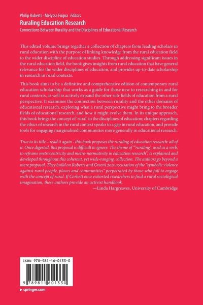 Ruraling education research.- Framing rural and remote: Key issues, debates, definitions and positions in constructing rural and remote disadvantage.- Rural social space: A conceptual-analytical framework for rural.- (Teacher) education and the rural human services.- Exploring the interplay of the 'Rural' and 'Community' in and for teacher education research.- The rural community walk: A structured learning experience for understanding place.- Using rural frameworks and research to develop understandings of educational justice and equity across socio-spatial settings.- Charter schools and the reconfiguring of the rural school-community Connection.- Erasing rurality: On the need to disaggregate statistical data.- Pathways, principals, and place.- Can boarding be better? Ethical dilemmas for policy-makers, education providers and evidence-makers.- Using rural education research to rethink literacies pedagogies.- How can rural education research make inclusive education better?- Linguistic landscape methodologies in rural education and educational research.- Dancing koalas, burning books and 'fair game': Using Butler's concept of performativity to examine rural gender performances.- Harnessing social capital in rural education research to promote aspiration and participation in learning.- The invisible cohort: Remote students' engagement and success in higher education.- The politics of ethics in rural social research: A cautionary tale.- Valuing the rural: Using an ethical lens to explore the impact of defining, doing and disseminating rural education research.- People, places, and communities in an urban century: Broadening rural education research.