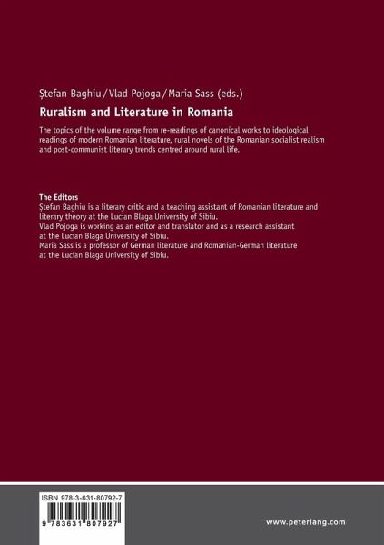 Ruralism and Literature in Romania: An Introduction - How to Populate a Country: A Quantitative Analysis of the Rural Novel from Romania (1900-2000) - Liviu Rebreanu: Zoopoetics in a Rural Environment - The Image of the Transylvanian Village in the Novels "Fünf Liter Zuika" by Paul Schuster and "Ion" by Liviu Rebreanu - The English Translation of Romanian Rural Novels in Communist Romania: Skopos Theory in Action - The Ideology of Ruralism in the Thaw Prose: The Case of Marin Preda s Morome ii - Rural Idiocy and Ugly Feelings: Muffled Brutality in the Socialist Realist Novel - Peasants and Intelligent Machines - Specters and Counter-Sites: Of Alternative Rural Geographies in Mircea Nedelciu's Fiction - The Border Village: A Path to Transnationalism - Inventing the Romanian Peasant in Transylvania during the Nineteenth Century - Science Popularization and Romanian Anarchism in the Nineteenth-Century - Social Class Difference and the Evolution of Romanian Literature from Lovinescu's Perspective (1924-1929) - From Science to Action: Professionalizing Social Work in Greater Romania - Diasporic Nationalism: German Regional Literature from Romania - Negotiating the Rural and the Rustic in the Romanian Avant-Garde - Linguistic Imaginary, Ruralism and Rurality in George Co buc's Writing - New Ruralism. From Village to Globe