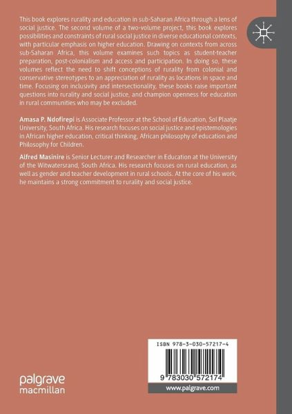 Chapter 1: Problematizing the concept of rurality within the context of higher education Jabulani Sibanda.- Chapter 2: Social justice reconsidered: making a defence for a university of critique again YusefWaghid, FaiqWaghid, and ZaydWaghid.- Chapter 3: Accessing, participation, achievement and rurality in higher education Simon Nenji & Amasa P. Ndofirepi.- Chapter 4: Relational spaces: a possibility for enhancing first year undergraduate rural student experiences on campus Elizabeth S. Ndofirepi and Felix Maringe.- Chapter 5: The ruzevha/ekhaya coloniality neologisms and access to higher education in Zimbabwe universities Joseph Hungwe.- Chapter 6: African Rurality and African Epistemology: Lessons for African Universities Ephraim T. Gwaravanda.- Chapter 7: The Rural gaze: Access, participation, and success in higher education. Hellen Agumba.- Chapter 8: The Rural Graduate and Endemic Challenges: Responses by African universities Mngomezulu B. R.- Chapter 9: Student teacher preparation for rural education: an issue of social justice in a post-apartheid South Africa Thabisile Nkambule.- Chapter 10: Parallels and Divergences in Decentralised Training Approaches: Reflecting on the experiences of two schools in a South African university Ntsiki Mapukata, Alfred Masinire & Thabisile Nkambule.- Chapter 11: Gender, rurality and higher education: Implications for generational inequality in Nigeria. Adepeju Aderogba-Oti.- Chapter 12: University lecturers as agents of change and social justice within a rural South African context Phefumula Nyoni.- Chapter 13: Rurality and Social justice in multiple contexts: deliberations revisited Amasa, P Ndofirepi and Alfred Masinire.