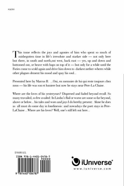 This tome reflects the joys and agonies of him who spent so much of misbegotten time in life's irresolute and starker side--not only here but there, in south and north,out west, back east--yes, up and down and bottomed out, or heave with haps on top of it--but only for a while until the Furies come to scold again and drive him down to darkest nether-wheres while other plagues dement his mood and spay his soul... Presented here by Marcus B. ...Oui, en memoire de lui qui reste toujours chez nous--his life was son et lumiere but now he stays near Pere-La Chaise.