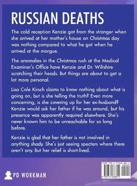 From USA Today Bestselling Author, P.D. Workman! Russian Deaths The cold reception Kenzie got from the stranger when she arrived at her mother's house on Christmas day was nothing compared to what he got when he arrived at the morgue. The anomalies in the Christmas rush at the Medical Examiner's Office have Kenzie and Dr. Wiltshire scratching their heads. But things are about to get a lot more personal. Lisa Cole Kirsch claims to know nothing about what is going on, but is she telling the truth? Even more concerning, is she covering up for her ex-husband? Kenzie would ask her father if he was around, but his presence was apparently required elsewhere. She's never known him to be unreachable for so long before. Kenzie is glad that her father is not involved in anything shady. She's just seeing specters where there aren't any. But her relief is short-lived. ¿¿¿¿¿¿¿¿¿¿ P.D. Workman is one of my favorite authors and can always be depended on to deliver a good solid read. I enjoyed this book and am looking forward to the next in the series. ¿¿¿¿¿¿¿¿¿¿ What an excellent story. This one kept me wondering what was happening with Kenzie's dad. So much going on. If you are a reader of the Zachary Goldman Mysteries series, you have already met Kenzie Kirsch. This series is a spinoff from Zachary Goldman Mysteries, giving Kenzie a front-and-center position in solving medical mysteries. Looking for a strong female lead in an engaging medical mystery? Award-winning and USA Today Bestselling Author P.D. Workman brings you an up-and-coming Medical Examiner's Assistant who is right up your alley. Join Dr. Kenzie Kirsch as she uncovers mysteries, conspiracies, and thrills!