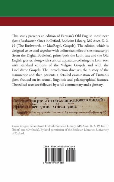 This study presents an edition of Farman's Old English interlinear gloss (Rushworth One) in Oxford, Bodleian Library, MS Auct. D. 2. 19 (The Rushworth, or MacRegol, Gospels). The edition, which is designed to be used together with online facsimiles of the manuscript (from the Digital Bodleian), prints both the Latin text and the Old English glosses, along with a critical apparatus collating the Latin text with standard editions of the Vulgate Gospels and with the Lindisfarne Gospels. The introduction discusses the history of the manuscript and then presents a detailed examination of Farman's gloss, focused on its textual, linguistic and palaeographical features. The edited texts are followed by a full commentary and a glossary.