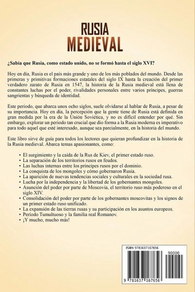 ¿Sabía que Rusia, como estado unido, no se formó hasta el siglo XVI? Hoy en día, Rusia es el país más grande y uno de los más poblados del mundo. Desde las primeras y primitivas formaciones estatales del siglo IX hasta la creación del primer verdadero zarato de Rusia en 1547, la historia de la Rusia medieval está llena de constantes luchas por el poder, rivalidades personales entre varios príncipes, guerras sangrientas y búsqueda de identidad. Este periodo, que abarca unos ocho siglos, suele olvidarse al hablar de Rusia, a pesar de su importancia. Hoy en día, la percepción que la gente tiene de Rusia está definida en gran medida por la era de la Unión Soviética, y no es difícil entender por qué. Sin embargo, explorar un periodo tan crucial que dio forma a la Rusia moderna es imperativo para todo aquel que esté interesado, aunque sea parcialmente, en la historia del mundo. Este libro sirve de guía para todos los lectores que quieran profundizar en la historia de la Rusia medieval. Abarca temas apasionantes, como:El surgimiento y la caída de la Rus de Kiev, el primer estado ruso. La separación de los territorios rusos en feudos. Las luchas internas entre los príncipes rusos por el dominio. La conquista de los mongoles y cómo gobernaron Rusia. La aparición de nuevas tendencias sociales y culturales en la sociedad rusa. Lucha por la independencia y la libertad de los gobernantes mongoles. Asunción del poder por parte de Moscovia, el territorio ruso más poderoso en el siglo XIV. Consolidación del poder por parte de los gobernantes moscovitas y los signos de un primer estado ruso unificado. La expansión de las tierras rusas y su participación en los asuntos europeos. Período Tumultuoso y la familia real Romanov. ¡Y mucho, mucho más! ¡Desplácese hacia arriba y haga clic en el botón añadir a la cesta para empezar a aprender más sobre la Rusia medieval!