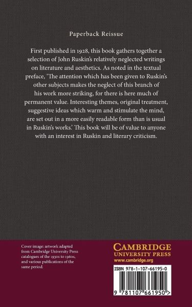 First published in 1928, this book gathers together a selection of John Ruskin's relatively neglected writings on literature and aesthetics. As noted in the textual preface, 'The attention which has been given to Ruskin's other subjects makes the neglect of this branch of his work more striking, for there is here much of permanent value. Interesting themes, original treatment, suggestive ideas which warm and stimulate the mind, are set out in a more easily readable form than is usual in Ruskin's works.' This book will be of value to anyone with an interest in Ruskin and literary criticism.