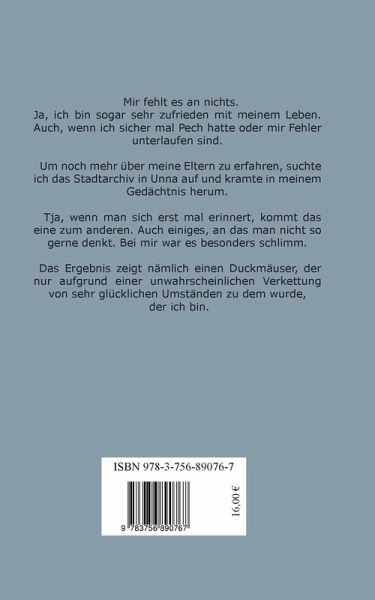 Mir fehlt es an nichts. Ja, ich bin sogar sehr zufrieden mit meinem Leben. Auch, wenn ich sicher mal Pech hatte oder mir Fehler unterlaufen sind. Um noch mehr über meine Eltern zu erfahren, suchte ich das Stadtarchiv in Unna auf und kramte in meinem Gedächtnis herum. Tja, wenn man sich erst mal erinnert, kommt das eine zum anderen. Auch einiges, an das man nicht so gerne denkt. Bei mir war es besonders schlimm. Das Ergebnis zeigt nämlich einen Schwächling, der nur aufgrund einer unwahrscheinlichen Verkettung von sehr glücklichen Umständen zu dem wurde, der ich bin.