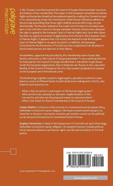 Introduction: Russia's Membership in the Council of Europe, Ten Years After; K.Malfliet & S.Parmentier PART I: A VIEW FROM WITHIN THE COUNCIL OF EUROPE Russia's Accession to the Council of Europe and the Fulfillment of its Obligations and Commitments; R.Bindig Democratic Reforms in Russia: The Role of the Monitoring Process of the Parliamentary Assembly of the Council of Europe; L.Van Den Brande PART II: THE INFLUENCE OF RUSSIA'S MEMBERSHIP OF THE COUNCIL OF EUROPE ON LEGAL REFORMS IN RUSSIA Russia and the Rule of Law; F.Feldbrugge The Impact of the European Convention on Human Rights on Russian Legislation and Judicial Practice; A.Kovler Russian Legal Reforms and the Council of Europe: One Step Forward, Two Steps Back; A.Fogelklou Adversarial Principles and the Case File in Russian Criminal Procedure; J.Kahn PART III: IS RUSSIA HONOURING ITS MEMBERSHIP OBLIGATIONS TO THE COUNCIL OF EUROPE? Gambling, Misunderstanding or Compromising? The Council of Europe and the War in Chechnya; A.Merlin Can the European Court of Human Rights Provide Justice for Victims of Russian Human Rights Abuses in Chechnya?; R.Lemaitre Conclusion: Future Perspectives; K.Malfliet & S.Parmentier