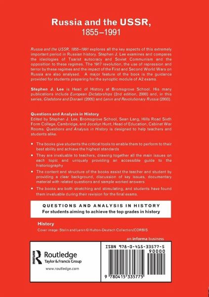 From a renowned name in A Level history publishing, this Questions and Analysis title looks at the many different aspects of Russian History across the period 1855?1991, including the ideologies of Tsarist autocracy and Soviet communism, parties and opposition to these regimes, the use of repression and terror and the impact of the First and Second World Wars on Russia.
