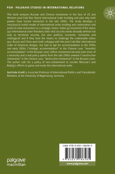 This book analyzes Russian and Chinese revisionism in the face of US and Western post-Cold War liberal international order building and asks why both powers have turned revisionist in the late 2000s. The study develops a neoclassical realist model of international order building and contestation and posits to view revisionism as a strategic choice. States go revisionist if the status quo international order threatens their vital security needs (broadly defined not only as territorial security, but also political, economic, normative and ontological) and if they have the means to challenge the undesirable status quo. Russia and China were both unhappy with the post-Cold War international order of American designs, but had to opt for accommodation in the 1990s and early 2000s ("strategic accommodation" in the Chinese case, "resentful accommodation" in the Russian case), before revisionism became even more of a necessity and a real policy option from the late 2000s onward ("constructive revisionism" in the Chinese case, "destructive revisionism" in the Russian case). The author calls for a policy of neo-containment to counter Moscow's and Beijing's efforts to game and erode the international order.