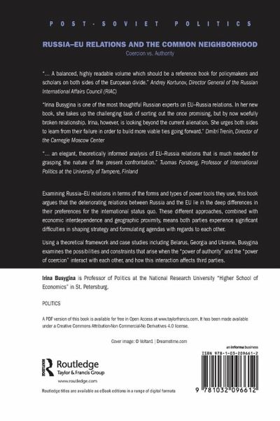 Examining Russia-EU relations in terms of the forms and types of power tools they use, this book argues that the deteriorating relations between Russia and the EU lie in the deep differences in their preferences for the international status quo. These different approaches, combined with economic interdependence and geographic proximity, means both parties experience significant difficulties in shaping strategy and formulating agendas with regards to each other. The Russian leadership is well aware of the EU's "authority orientation" but fails to reliably predict foreign policy at the EU level, whilst the EU realizes Russia's "coercive orientation" in general, but cannot predict when and where coercive tools will be used next. Russia is gradually realizing the importance of authority, while the EU sees the necessity of coercion tools for coping with certain challenges. The learning process is ongoing but the basic distinction remains unchanged and so their approaches cannot be reconciled as long as both actors exist in their current form. Using a theoretical framework and case studies including Belarus, Georgia and Ukraine, Busygina examines the possibilities and constraints that arise when the "power of authority" and the "power of coercion" interact with each other, and how this interaction affects third parties.