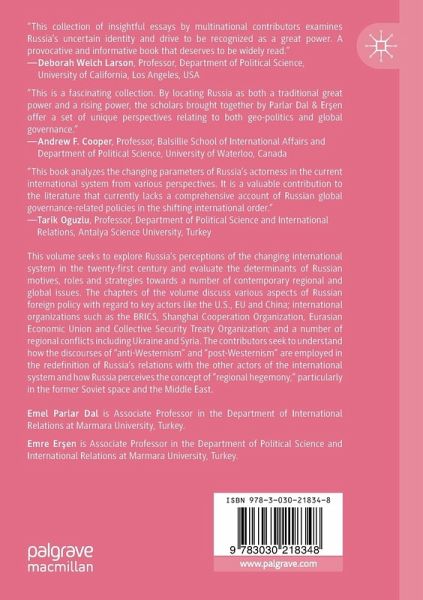 This volume seeks to explore Russia's perceptions of the changing international system in the twenty-first century and evaluate the determinants of Russian motives, roles and strategies towards a number of contemporary regional and global issues. The chapters of the volume discuss various aspects of Russian foreign policy with regard to key actors like the U.S., EU and China; international organizations such as the BRICS, Shanghai Cooperation Organization, Eurasian Economic Union and Collective Security Treaty Organization; and a number of regional conflicts including Ukraine and Syria. The contributors seek to understand how the discourses of "anti-Westernism" and "post-Westernism" are employed in the redefinition of Russia's relations with the other actors of the international system and how Russia perceives the concept of "regional hegemony," particularly in the former Soviet space and the Middle East.