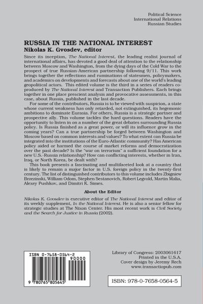 Since its inception, The National Interest, the leading realist journal of international affairs, has devoted a good deal of attention to the relationship between Moscow and Washington, from the dying days of the Cold War to the prospect of true Russian-American partnership following 9/11. This work brings together the reflections and ruminations of statesmen, policymakers, and academics on developments and forecasts about one of the world's leading geo political actors. This edited volume is the third in a series of readers co-produced by The National Interest and Transaction Publishers. Each brings together in one place prescient analysis and provocative assessments, this case, about Russia, published in the last decade.For some of the contributors, Russia is to be viewed with suspicion, a state whose current weakness has only retarded, not extinguished, its hegemonic ambitions to dominate Eurasia. For others, Russia is a strategic partner and prospective ally. This volume tackles the hard questions. Readers have the opportunity to listen in on a number of the great debates surrounding Russia policy. Is Russia finished as a great power, or will its influence grow in the coming years? Can a true partnership be forged between Washington and Moscow based on common interests and values? To what extent can Russia be integrated into the institutions of the Euro-Atlantic community? Has American policy aided or harmed the course of market reforms and democratization over the past decade? Is the "war on terrorism" a sufficient foundation for a new U.S.-Russia relationship? How can conflicting interests, whether in Iran, Iraq, or North Korea, be dealt with?This book presents a fascinating and multifaceted look at a country that is likely to remain a major factor in U.S. foreign policy in the twenty-first century. The list of distinguished contributors to this volume includes Zbigniew Brzezinski, William Odom, Stephen Sestanovich, Robert Legvold, Martin Malia, Alexey Pushkov, and Dimitri K. Simes.