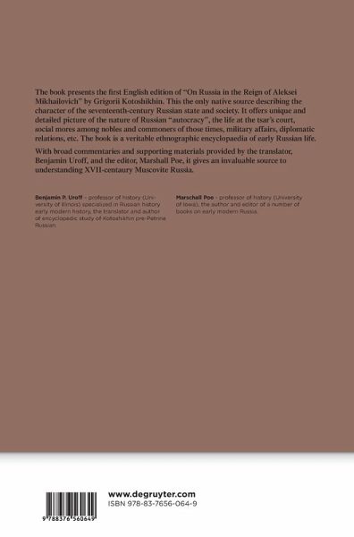 The book presents the first English edition of "On Russia in the Reign of Aleksei Mikhailovich" by Grigorii Kotoshikhin. This is the only native source describing the character of the seventeenth-century Russian state and society. It offers a unique and detailed picture of the nature of Russian "autocracy", the life at the tsar's court, social mores of the nobles and commoners of those times, military affairs, diplomatic relations, etc. The book is a veritable ethnographic encyclopedia of early Russian life.
