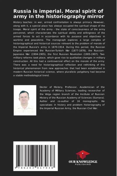 History teaches: in war, armed confrontation is always primary. However, along with it, a special place has always occupied the spiritual shape of the troops. Moral spirit of the army - the state of consciousness of the army personnel, which characterizes the spiritual ability and willingness of the armed forces to act in accordance with its purpose and objectives in wartime and peacetime. The monograph explores a large complex of historiographical and historical sources relevant to the problem of morale of the Imperial Russia's army in 1870-1914. During this period, the Russian Empire experienced the Russian-Turkish War (1877-1878), the Russian-Japanese War (1904-1905), the first Russian Revolution (1905-1907). Two military reforms took place, which gave rise to qualitative changes in military construction. All this had a controversial effect on the morale of the army. There was a need for historiographical reflection and rethinking of this historical phenomenon from new approaches that had been established in modern Russian historical science, where pluralistic polyphony had become a stable methodological trend.