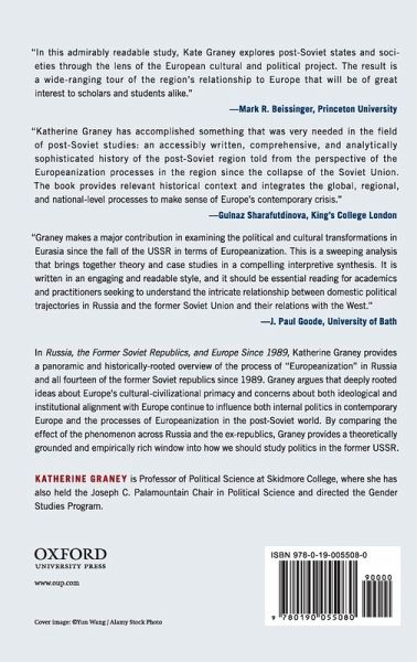 Nearly three decades after the fall of the Berlin Wall, early hopes for the integration of the post-Soviet states into a "Europe whole and free" seem to have been decisively dashed. Europe itself is in the midst of a multifaceted crisis that threatens the considerable gains of the post-war liberal European experiment. In Russia, the Former Soviet Republics, and Europe Since 1989, Katherine Graney provides a panoramic and historically-rooted overview of the process of "Europeanization" in Russia and all fourteen of the former Soviet republics since 1989. Graney argues that deeply rooted ideas about Europe's cultural-civilizational primacy and concerns about both ideological and institutional alignment with Europe continue to influence both internal politics in contemporary Europe and the processes of Europeanization in the post-Soviet world. By comparing the effect of the phenomenon across Russia and the ex-republics, Graney provides a theoretically grounded and empirically rich window into how we should study politics in the former USSR.