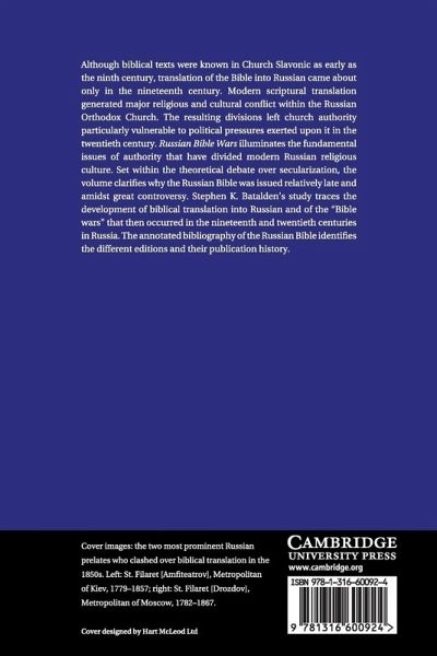 Although biblical texts were known in Church Slavonic as early as the ninth century, translation of the Bible into Russian came about only in the nineteenth century. Modern scriptural translation generated major religious and cultural conflict within the Russian Orthodox church. The resulting divisions left church authority particularly vulnerable to political pressures exerted upon it in the twentieth century. Russian Bible Wars illuminates the fundamental issues of authority that have divided modern Russian religious culture. Set within the theoretical debate over secularization, the volume clarifies why the Russian Bible was issued relatively late and amidst great controversy. Stephen Batalden's study traces the development of biblical translation into Russian and of the 'Bible wars' that then occurred in the nineteenth and twentieth centuries in Russia. The annotated bibliography of the Russian Bible identifies the different editions and their publication history.