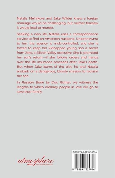 Natalia Melnikova and Jake Wilder knew a foreign marriage would be challenging, but neither foresaw it would lead to murder. Seeking a new life, Natalia uses a correspondence service to find an American husband. Unbeknownst to her, the agency is mob-controlled, and she is forced to keep her kidnapped young son a secret from Jake, a Silicon Valley executive. She is promised her son's return-if she follows orders and hands over the life insurance proceeds after Jake's death. But when Jake learns of the plot, he and Natalia embark on a dangerous, bloody mission to reclaim her son. In Russian Bride by Doc Richter, we witness the lengths to which ordinary people in love will go to save their family.