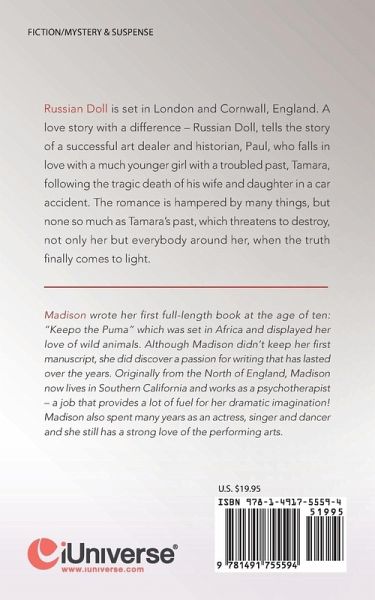 Russian Doll is set in London and Cornwall, England. A love story with a difference - Russian Doll, tells the story of a successful art dealer and historian, Paul, who falls in love with a much younger girl with a troubled past, Tamara, following the tragic death of his wife and daughter in a car accident. The romance is hampered by many things, but none so much as Tamara's past, which threatens to destroy, not only her but everybody around her, when the truth finally comes to light.
