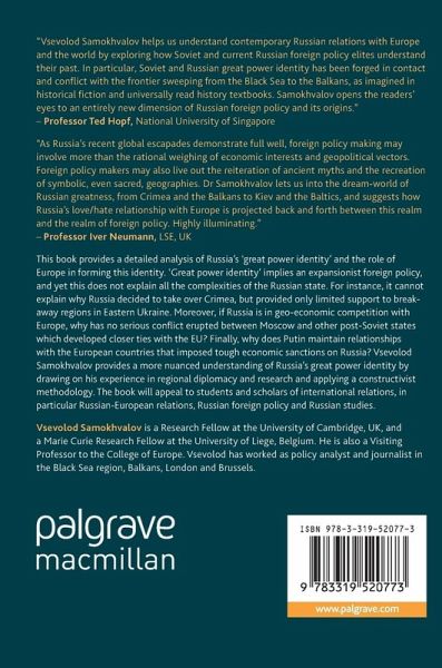 "VSEVOLOD SAMOKHVALOV'S BOOK OFFERS A USEFUL IN-DEPTH ANALYSIS of Russia's evolving great power identity and representations of Europe, with an empirical focus on European-Russian interaction in the Balkans and the Black Sea region. ... Samokhvalov's book provides an essential and balanced contribution to understanding European-Russian relations through a solid theoretical approach and impressively vast empirical work." (Marco-Siddi, Europe-Asia Studies, Vol. 71 (2), 2019)