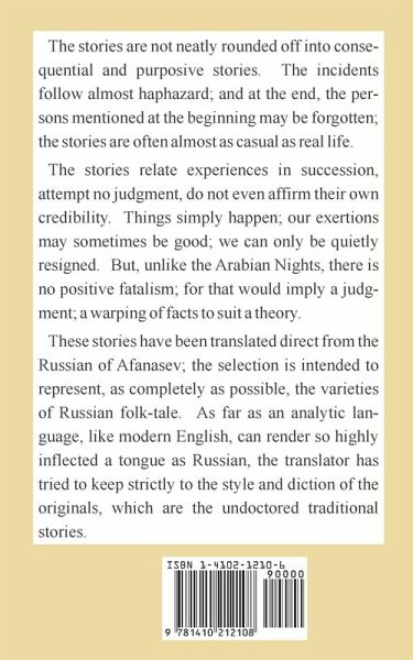 The stories are not neatly rounded off into consequential and purposive stories. The incidents follow almost haphazard; and at the end, the persons mentioned at the beginning may be forgotten; the stories are often almost as casual as real life. The stories relate experiences in succession, attempt no judgment, do not even affirm their own credibility. Things simply happen; our exertions may sometimes be good; we can only be quietly resigned. But, unlike the Arabian Nights, there is no positive fatalism; for that would imply a judgment; a warping of facts to suit a theory. These stories have been translated direct from the Russian of Afanasev; the selection is intended to represent, as completely as possible, the varieties of Russian folk-tale. As far as an analytic language, like modern English, can render so highly inflected a tongue as Russian, the translator has tried to keep strictly to the style and diction of the originals, which are the undoctored traditional stories.