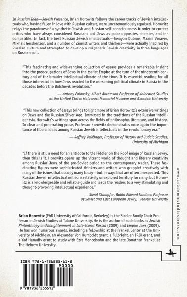 In Russian Idea-Jewish Presence, Professor Brian Horowitz follows the career tracks of Jewish intellectuals who, having fallen in love with Russian culture, were unceremoniously repulsed. Horowitz relays the paradoxes of a synthetic Jewish and Russian self-consciousness in order to correct critics who have always considered Russians and Jews as polar opposites, enemies, and incompatible. In fact, the best Russian-Jewish intellectuals-Semyon Dubnov, Maxim Vinaver, Mikhail Gershenzon, and a number of Zionist writers and thinkers-were actually inspired by Russian culture and attempted to develop a sui generis Jewish creativity in three languages on Russian soil.