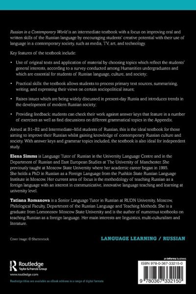 Aimed at B1-B2 and Intermediate-Mid students of Russian, this is the ideal textbook for those aiming to improve their Russian whilst gaining knowledge of contemporary Russian culture and society. With answer keys and grammar topics included, the textbook is also ideal for independent study.