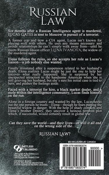 Six months after a Russian Intelligence agent is murdered, Lucas Gates is sent to Moscow in pursuit of a terrorist. A former cop and now a CIA agent, Lucas isn't known for playing well with others. He uses any means necessary and avoids relationships he can't simply walk away from-until he meets Russian liaison officer Elena Ivanova, the widow of the murdered agent. Elena follows the rules, so she accepts her role as Lucas's liaison-a job nobody else wanted. Finally reinstated after a suspension related to her husband's death, Elena realizes Lucas might be just the one to help her uncover what really happened. She is surprised by her unexpected attraction to the handsome American when she is still grieving her husband, but she's sure his initial case is tied to hers, and pushes the feelings aside. Faced with a terrorist for hire, a black market dealer, and a mole within the intelligence community, Lucas finds himself on the run. Alone in a foreign country and wanted by the law, Lucas seeks out the one person he trusts-Elena-though he fears putting the beautiful widow in danger. With the help of shady contacts and Elena's brother Dmitry, they uncover a heinous terrorist plot which, if successful, would certainly result in global war. Can they save the world-and their lives-or will it all end on the wrong side of the... Russian Law?