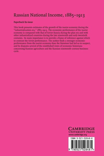 This book presents estimates of the growth of the tsarist economy during the 'industrialization era', 1885-1913. The performance of the tsarist economy is compared with that of Soviet Russia during the plan era and of other industrialized countries during the late nineteenth and early twentieth centuries. Its main importance is to provide a frame of reference against which to contrast the Soviet performance. The author finds a stronger performance from the tsarist economy than the literature had led us to suspect, and he disputes several of the established views of economic historians concerning Russian agriculture and the Russian nineteenth-century business cycle.