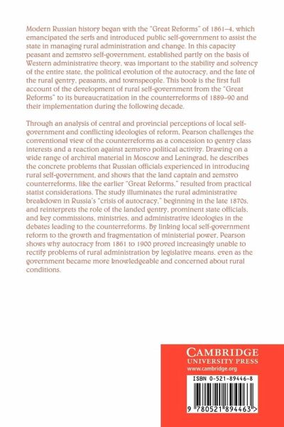 This book is the first full account of the development of rural self-government in Russia from the emancipation of the serfs to its bureaucratisation in the counter-reforms of 1889-90. Through analysis of central and provincial perceptions of local self-government and conflicting ideologies of reform. Professor Pearson challenges the conventional view of the counter-reforms as a concession to gentry class interests and a reaction against 'zemstvo' political activity. The study illuminates the rural administrative breakdown during Russia's 'crisis of autocracy', beginning in the late 1870s, and reinterprets the role of the landed gentry, prominent state officials, and key commissions, ministries and administrative ideologies in the debates leading to the counter-reforms.
