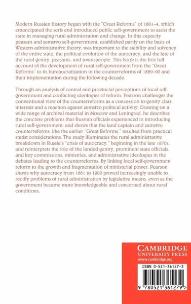 This book is the first full account of the development of rural self-government in Russia from the emancipation of the serfs to its bureaucratisation in the counter-reforms of 1889-90. Through analysis of central and provincial perceptions of local self-government and conflicting ideologies of reform. Professor Pearson challenges the conventional view of the counter-reforms as a concession to gentry class interests and a reaction against 'zemstvo' political activity. The study illuminates the rural administrative breakdown during Russia's 'crisis of autocracy', beginning in the late 1870s, and reinterprets the role of the landed gentry, prominent state officials, and key commissions, ministries and administrative ideologies in the debates leading to the counter-reforms.
