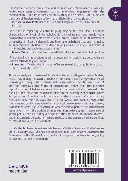 This book analyzes the nature of Russia's involvement with globalization. To date, Russia has mainly followed a course of selective openness governed by an increasingly strong state pursuing self-determination and its own vision of strategic objectives and forms of cooperation, rather than the projected reproduction of global convergence. It is also a country that is believed to be finding a new place and position for itself in the evolving global order, where European and American reflections shape the treatment of contemporary questions concerning Russia's status in the world. The book highlights the problems and conflicts associated with political developments, democratization, economic reforms, and innovation, as well as societal perceptions and national identity formation. The world is shifting, with Russia developing its own vision of global politics and cultivating a pragmatic strategy based on national interest, one that supports globalization where necessary and opposes it where conflicts of interest and values are inevitable.