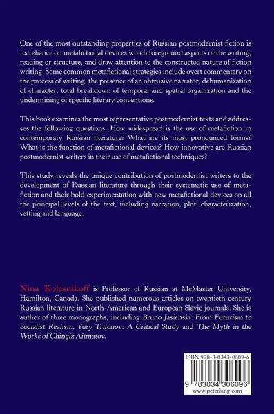 This study reveals the unique contribution of postmodernist writers to the development of Russian literature through their systematic use of metafiction and their bold experimentation with new metafictional devices on all the principal levels of the text, including narration, plot, characterization, setting and language.