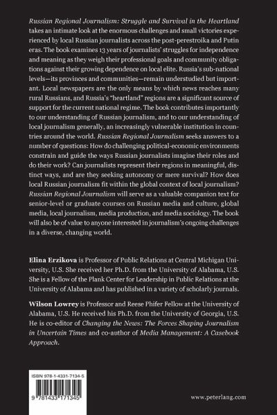 Russian Regional Journalism: Struggle and Survival in the Heartland takes an intimate look at the enormous challenges and small victories experienced by local Russian journalists across the post-perestroika and Putin eras. The book examines 13 years of journalists' struggles for independence and meaning as they weigh their professional goals and community obligations against their growing dependence on local elite. Russia's sub-national levels-its provinces and communities-remain understudied but important. Local newspapers are the only means by which news reaches many rural Russians, and Russia's "heartland" regions are a significant source of support for the current national regime. The book contributes importantly to our understanding of Russian journalism, and to our understanding of local journalism generally, an increasingly vulnerable institution in countries around the world. Russian Regional Journalism seeks answers to a number of questions: How do challenging political-economic environments constrain and guide the ways Russian journalists imagine their roles and do their work? Can journalists represent their regions in meaningful, distinct ways, and are they seeking autonomy or mere survival? How does local Russian journalism fit within the global context of local journalism? Russian Regional Journalism will serve as a valuable companion text for senior-level or graduate courses on Russian media and culture, global media, local journalism, media production, and media sociology. The book will also be of value to anyone interested in journalism's ongoing challenges in a diverse, changing world.