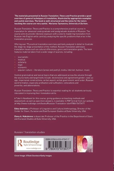 Russian Translation: Theory and Practice is a comprehensive practical course in translation for advanced undergraduate and postgraduate students of Russian. The course aims to provide intensive exposure with a view to mastering translation from Russian into English while carefully analyzing the specific problems that arise in the translation process. Offering over 75 practical translation exercises and texts analyzed in detail to illustrate the stage-by-stage presentation of the method, Russian Translation addresses translation issues such as cultural differences, genre and translation goals. The book features material taken from a wide range of sources, including: journalistic medical scholarly legal economic popular culture - literature (prose and poetry), media, internet, humour, music. Central grammatical and lexical topics that will be addressed across the volume through the source texts and target texts include: declensional and agreement gender; case usage; impersonal constructions; verbal aspect; verbal government; word order; Russian word formation, especially prefixation and suffixation; collocations and proverbs; and abbreviations. Russian Translation: Theory and Practice is essential reading for all students seriously interested in improving their translation skills. A Tutor's Handbook for this course, giving guidance on teaching methods and assessment, as well as specimen answers, is available in PDF format from our website at http://www.routledge.com/books/Russian-Translation-isbn9780415473477. Edna Andrews is Professor of Linguistics and Cultural Anthropology, Director of the Center for Slavic, Eurasian and East European Studies at Duke University, USA. Elena Maksimova is Associate Professor of the Practice in the Department of Slavic and Eurasian Studies at Duke University, USA.