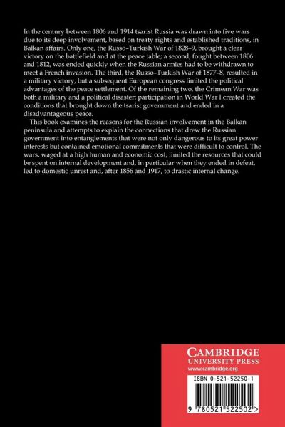 In the century between 1806 and 1914 tsarist Russia was drawn into five wars due to its deep involvement, based on treaty rights and established traditions, in Balkan affairs. This book examines the reason for the Russian involvement in the Balkan peninsula and attempts to explain at least partially the connection that drew the Russian government into entanglements that were not only dangerous to its great power interests, but were also difficult to control. The wars, waged at a high human and economic cost, limited the resources that could be spent on internal development and in particular when they ended in defeat, led to domestic unrest and after 1856 and 1917 to drastic internal change.