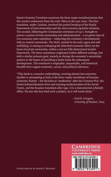 Russia's Economic Transitions examines the three major transformations that the country underwent from the early 1860s to 2000. The first transition, under Tsarism, involved the partial break-up of the feudal framework of land ownership and the move toward capitalist relations. The second, following the Communist revolution of 1917, brought to power a system of state ownership and administration - a sui generis type of war-economy state capitalism - subjecting the economy's development to central commands. The third, started in the early 1990s and still unfolding, is aiming at reshaping the inherited economic fabric on the basis of private ownership. The three transitions originated within different settings, but with a similar primary goal, namely the changing of the economy's ownership pattern in the hopes of providing a better basis for subsequent development. The treatment's originality, impartiality and historical breadth have cogent economic, social and political relevance.