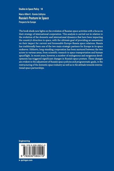 The book sheds new lights on the evolution of Russian space activities with a focus on their strategy of international cooperation. This analysis is carried out in relation to the evolution of the domestic and international dynamics that have been impacting the country's direction in space, with the ultimate goal of providing an assessment on their impact for current and foreseeable Europe-Russia space relations. Russia has traditionally been one of the two main strategic partners for Europe in its space endeavor. Hitherto, long-standing cooperation has been nurtured between the two actors in various areas, from scientific research to space transportation and human spaceflight. In recent years, however, a number of endogenous and exogenous developments has triggered significant changes in Russia's space posture. These changes are evident in the adjustment of Russia's space policies and programmatic goals, in the restructuring of the domestic space industry as well as in the attitude towards international space partnerships.