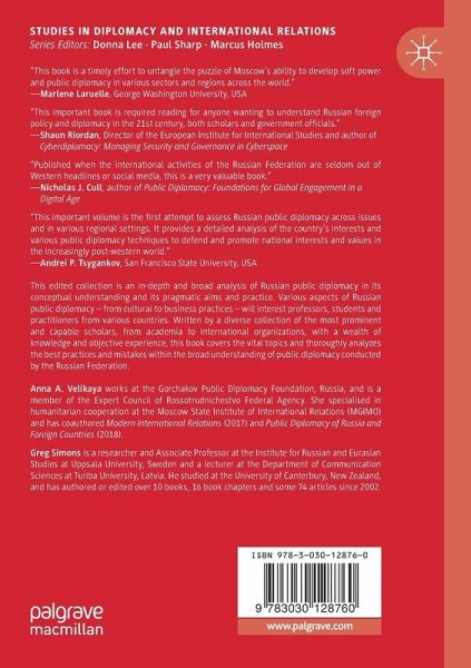 Preface - Alexey Bogaturov.- 1 Introduction - Anna A.Velikaya and Greg Simons.- 2 Russian Public Diplomacy: Historical Aspects - Olga Lebedeva.- 3 Russian Public Diplomacy and Nation Branding - Semed A. Semedov and Anastasiya G. Kurbatova.- 4 Development Diplomacy of the Russian Federation - Stanislav Tkachenko.- 5 Russia's policy and international cooperation: the challenges and opportunities of soft power - Natalia Bubnova.- 6 Russian Digital Diplomacy: A Rising Cyber Soft-Power? - Natalia Tsvetkova.- 7 Russian Public Diplomacy Through Higher Education - Alexey Fominykh.- 8 Russian Science Diplomacy - Elena Kharitonova & Irina Prokhorenko.- 9 The Role of civil society in Russian Public Diplomacy - Elena Stetsko.- 10 Multiple facets of Russian public diplomacy in international organizations: a case study - Marina Chepurina and Evgeny Kuznetsov.- 11 Russian business diplomacy in the South and Southeast Asia - Andrey Bykov & Kirill Solntsev.- 12 The Baltic Sea Region - Cooperation in the Human Dimension - Daria Akhutina.- 13 Strategic communication of Russia in Latin America - Evgeny N. Pashentsev.- 14 Public Diplomacy of Russia in the Middle East.- Vladimir Morozov and Greg Simons.- 15 Conclusion - Anna A. Velikaya and Greg Simons.