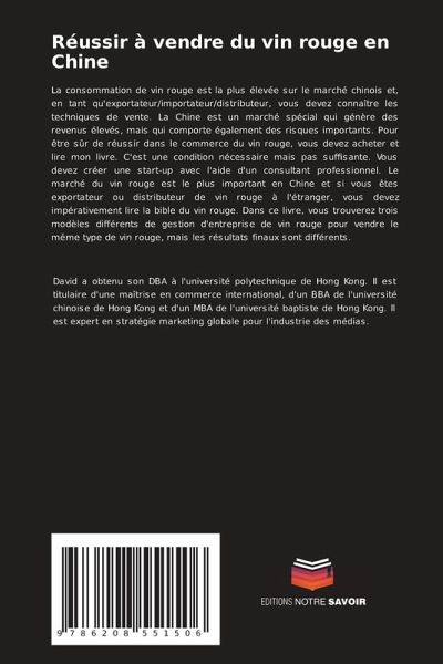 La consommation de vin rouge est la plus élevée sur le marché chinois et, en tant qu'exportateur/importateur/distributeur, vous devez connaître les techniques de vente. La Chine est un marché spécial qui génère des revenus élevés, mais qui comporte également des risques importants. Pour être sûr de réussir dans le commerce du vin rouge, vous devez acheter et lire mon livre. C'est une condition nécessaire mais pas suffisante. Vous devez créer une start-up avec l'aide d'un consultant professionnel. Le marché du vin rouge est le plus important en Chine et si vous êtes exportateur ou distributeur de vin rouge à l'étranger, vous devez impérativement lire la bible du vin rouge. Dans ce livre, vous trouverez trois modèles différents de gestion d'entreprise de vin rouge pour vendre le même type de vin rouge, mais les résultats finaux sont différents.