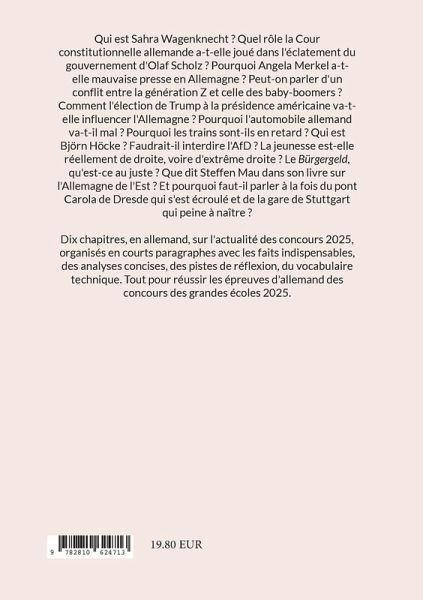Qui est Sahra Wagenknecht ? Quel rôle la Cour constitutionnelle allemande a-t-elle joué dans l'éclatement du gouvernement d'Olaf Scholz ? Pourquoi Angela Merkel a-t-elle mauvaise presse en Allemagne ? Peut-on parler d'un conflit entre la génération Z et celle des baby-boomers ? Comment l'élection de Trump à la présidence américaine va-t-elle influencer l'Allemagne ? Pourquoi l'automobile allemand va-t-il mal ? Pourquoi les trains sont-ils en retard ? Qui est Björn Höcke ? Faudrait-il interdire l'AfD ? La jeunesse est-elle réellement de droite, voire d'extrême droite ? Le Bürgergeld, qu'est-ce au juste ? Que dit le sociologue Steffen Mau dans son livre sur l'Allemagne de l'Est ? Et pourquoi faut-il parler à la fois du pont Carola de Dresde qui s'est écroulé et de la gare de Stuttgart qui peine à naître ? Dix chapitres, en allemand, sur l'actualité des concours 2025, organisés en courts paragraphes avec les faits indispensables, des analyses concises, des pistes de réflexion, du vocabulaire technique. Tout pour réussir les épreuves d'allemand des concours des grandes écoles 2025.