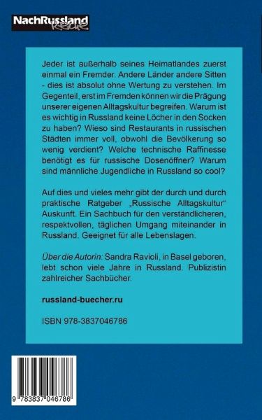 Jeder ist außerhalb seines Heimatlandes zuerst einmal ein Fremder. Andere Länder andere Sitten - dies ist absolut ohne Wertung zu verstehen. Im Gegenteil, erst im Fremden können wir die Prägung unserer eigenen Alltagskultur begreifen. Warum ist es wichtig in Russland keine Löcher in den Socken zu haben? Wieso sind Restaurants in russischen Städten immer voll, obwohl die Bevölkerung so wenig verdient? Welche technische Raffinesse braucht es für russische Dosenöffner? Warum sind männlichen Jugendliche in Russland so cool? Auf dies und vieles mehr gibt der durch und durch praktische Ratgeber "Russische Alltagskultur" Auskunft. Ein Sachbuch für den verständlicheren, respektvollen, täglichen Umgang in Russland. Geeignet für alle Lebenslagen. Für Business, für Touristen und Studenten.