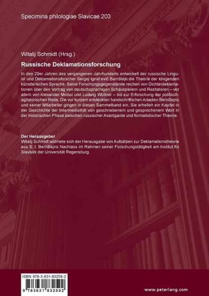 In den 20er Jahren des vergangenen Jahrhunderts entwickelt der russische Linguist und Deklamationsforscher Sergej Ignat'evic Bernstejn die Theorie der klingenden künstlerischen Sprache. Seine Forschungsgegenstände reichen von Dichterdeklamationen über den Vortrag von deutschsprachigen Schauspielern und Rezitatoren - vor allem von Alexander Moissi und Ludwig Wüllner - bis zur Erforschung der politisch-agitatorischen Rede. Die vor kurzem entdeckten handschriftlichen Arbeiten Bernstejns und seiner Mitarbeiter gingen in diesen Sammelband ein. Sie erhellen ein Kapitel in der Geschichte der Intermedialität von geschriebenem und gesprochenem Wort in der historischen Phase zwischen russischer Avantgarde und formalistischer Theorie.