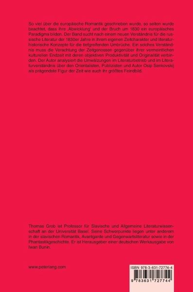 So viel über die europäische Romantik geschrieben wurde, so selten wurde beachtet, dass ihre «Abwicklung» und der Bruch um 1830 ein europäisches Paradigma bilden. Der Band sucht nach einem neuen Verständnis für die russische Literatur der 1830er Jahre in ihrem eigenen Zeitcharakter und literaturhistorische Konzepte für die tiefgreifenden Umbrüche. Ein solches Verständnis muss die Verachtung der Zeitgenossen gegenüber ihrer vermeintlichen kulturellen Endzeit mit deren objektiven Produktivität und Originalität verbinden. Der Autor analysiert die Umwälzungen im Literaturbetrieb und im Literaturverständnis über den Orientalisten, Publizisten und Autor Osip Senkovskij als prägendste Figur der Zeit wie auch ihr größtes Feindbild.