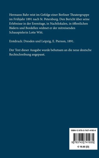 Hermann Bahr: Russische ReiseHermann Bahr reist im Gefolge einer Berliner Theatergruppe im Frühjahr 1891 nach St. Petersburg. Den Bericht über seine Erlebnisse in der Eremitage, in Nachtlokalen, in öffentlichen Bädern und Bordellen widmet er der mitreisenden Schauspielerin Lotte Witt.Erstdruck: Dresden und Leipzig, E. Pierson, 1891.Neuausgabe, herausgegeben von Karl-Maria Guth, Berlin 2023.Der Text dieser Ausgabe wurde behutsam an die neue deutsche Rechtschreibung angepasst.Umschlagabbildung: Fyodor Vasilyev, Beleuchtung in St. Petersburg, 1869Gesetzt aus der Minion Pro, 11 pt.Die Sammlung Hofenberg erscheint im Verlag Henricus - Edition Deutsche Klassik GmbH, Berlin