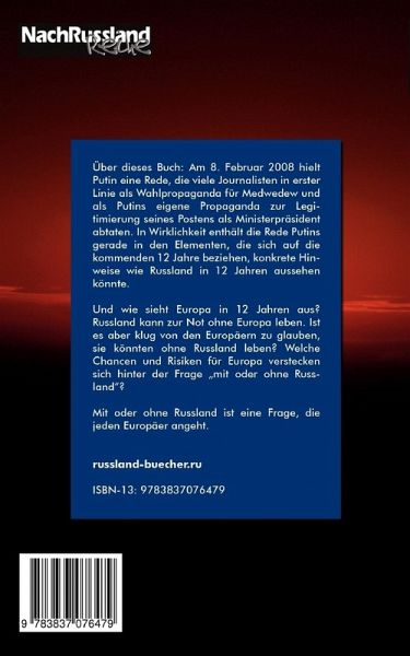 Am 8. Februar 2008 hielt Putin eine Rede, die viele Journalisten in erster Linie als Wahlpropaganda für Medwedew und als Putins eigene Propaganda zur Legitimierung seines Postens als Ministerpräsident abtaten.In Wirklichkeit enthält die Rede Putins gerade in den Elementen, die sich auf die kommenden 12 Jahre beziehen, konkrete Hinweise wie Russland in 12 Jahren aussehen könnte.Und wie sieht Europa in 12 Jahren aus? Russland kann zur Not ohne Europa leben. Ist es aber klug von den Europäern zu glauben, sie könnten ohne Russland leben? Welche Chancen und Risiken für Europa verstecken sich hinter der Frage "mit oder ohne Russland"?Wohin geht Europa zurzeit und was könnte passieren, wenn Europa nicht endlich seine alten Ressentiments über Bord wirft? Mit oder ohne Russland ist eine Frage, die jeden Europäer angeht.