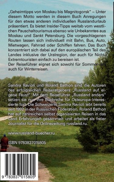Geheimtipps von Moskau bis Magnitogorsk - unter diesem Motto werden in diesem Buch Anregungen für den etwas anderen individuellen Russlandurlaub präsentiert. Es bietet Insider-Tipps weitab vom westlichen Pauschaltourismus ebenso wie Unbekanntes aus Moskau und Sankt Petersburg. Die vorgeschlagenen Routen lassen sich individuell mit Bahn, Bus, Auto, Mietwagen, Fahrrad oder Schiffen fahren. Das Buch konzentriert sich dabei auf den europäischen Teil des Landes inklusive der Uralregion, der auch für Nicht-Extremtouristen einfach zu bereisen ist. Der Reiseführer eignet sich sowohl für Sommer als auch für Winterreisen.