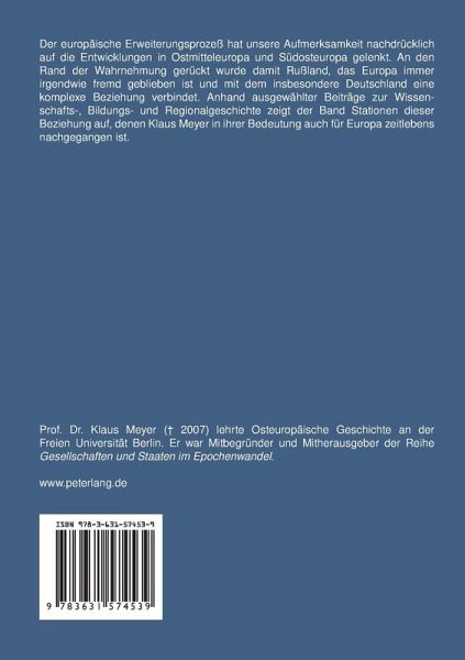 Der europäische Erweiterungsprozeß hat unsere Aufmerksamkeit nachdrücklich auf die Entwicklungen in Ostmitteleuropa und Südosteuropa gelenkt. An den Rand der Wahrnehmung gerückt wurde damit Rußland, das Europa immer irgendwie fremd geblieben ist und mit dem insbesondere Deutschland eine komplexe Beziehung verbindet. Anhand ausgewählter Beiträge zur Wissenschafts-, Bildungs- und Regionalgeschichte zeigt der Band Stationen dieser Beziehung auf, denen Klaus Meyer in ihrer Bedeutung auch für Europa zeitlebens nachgegangen ist.