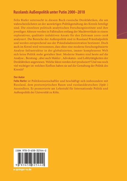 Felix Riefer untersucht in diesem Buch russische Denkfabriken, die am wahrscheinlichsten an der auswärtigen Politikgestaltung des Kremls beteiligt sind. Die einzelnen politisch-analytischen Forschungsinstitute und ihre jeweiligen Akteure werden in Fallstudien entlang der Machtvertikale in einem explorativen, qualitativ-induktiven Ansatz für den Zeitraum 2000-2018 analysiert. Die Bereiche der Außenpolitik sind in Russland Präsidialpolitik und werden entsprechend aus der Präsidialadministration bestimmt. Doch auch im Kreml wird vernommen, dass ohne eine moderne forschungsbasierte Analyse-Infrastruktur in der globalisierten, immer komplexeren Welt sich keine Politik mehr gestalten lässt. Moderne Staaten sind heute auf die Analyse-, Beratung-, aber auch Makler-, Advokaten- und Lobbytätigkeiten der Denkfabriken angewiesen. Welche Ideen werden dort produziert? Und was noch viel wichtiger ist: welchen Einfluss haben sie auf die Gestaltung der Politik des Kremls?