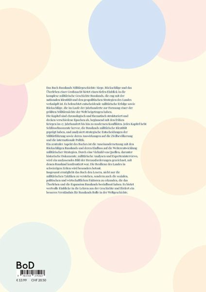 Das Buch Russlands Militärgeschichte: Siege, Rückschläge und das Überleben einer Großmacht bietet einen tiefen Einblick in die komplexe militärische Geschichte Russlands, die eng mit der nationalen Identität und den geopolitischen Strategien des Landes verknüpft ist. Es beleuchtet entscheidende militärische Erfolge sowie Rückschläge, die im Laufe der Jahrhunderte zur Formung einer der größten Militärmächte der Welt beigetragen haben. Die Kapitel sind chronologisch und thematisch strukturiert und decken verschiedene Epochen ab, beginnend mit den frühen Kriegen im 17. Jahrhundert bis hin zu modernen Konflikten. Jedes Kapitel hebt Schlüsselmomente hervor, die Russlands militärische Identität geprägt haben, und analysiert strategische Entscheidungen der Militärführung sowie deren Auswirkungen auf die Zivilbevölkerung und die internationale Politik. Ein zentraler Aspekt des Buches ist die Auseinandersetzung mit den Rückschlägen Russlands und deren Einfluss auf die Weiterentwicklung militärischer Strategien. Durch eine Vielzahl von Quellen, darunter historische Dokumente, militärische Analysen und Experteninterviews, wird ein umfassendes Bild der Herausforderungen gezeichnet, mit denen Russland konfrontiert war. Die Resilienz des Landes in schwierigen Zeiten wird besonders betont. Insgesamt ermöglicht das Buch den Lesern, nicht nur die militärischen Taktiken zu verstehen, sondern auch die sozialen, politischen und wirtschaftlichen Faktoren zu erkunden, die das Überleben und die Expansion Russlands beeinflusst haben. Es bietet wertvolle Einblicke in die Lehren aus der Geschichte und fördert ein besseres Verständnis für Russlands Rolle in der Weltgeschichte.